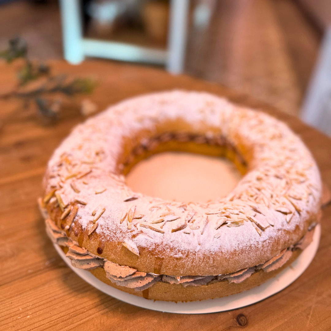 Roscón de Reyes con masa tierna y aromática, relleno de una trufa suave y chocolateada que aporta un sabor intenso y delicioso en cada bocado. Decorado con almendra laminada ligeramente tostada y una capa de azúcar crujiente que realza su carácter tradicional. El roscón perfecto para quienes buscan un toque goloso y especial en la celebración del Día de Reyes.