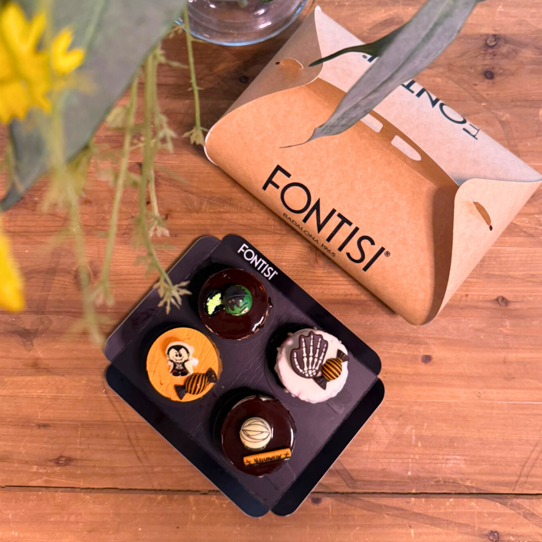 Disfruta de este pack de 4 pasteles individuales elaborados artesanalmente en nuestro obrador y decorados con figuras de chocolate blanco y negro con temática de Halloween.